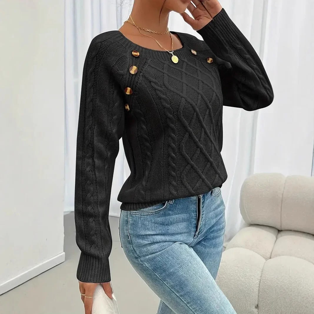 Dames trui met gedraaid breisel en knoopaccent op de schouder